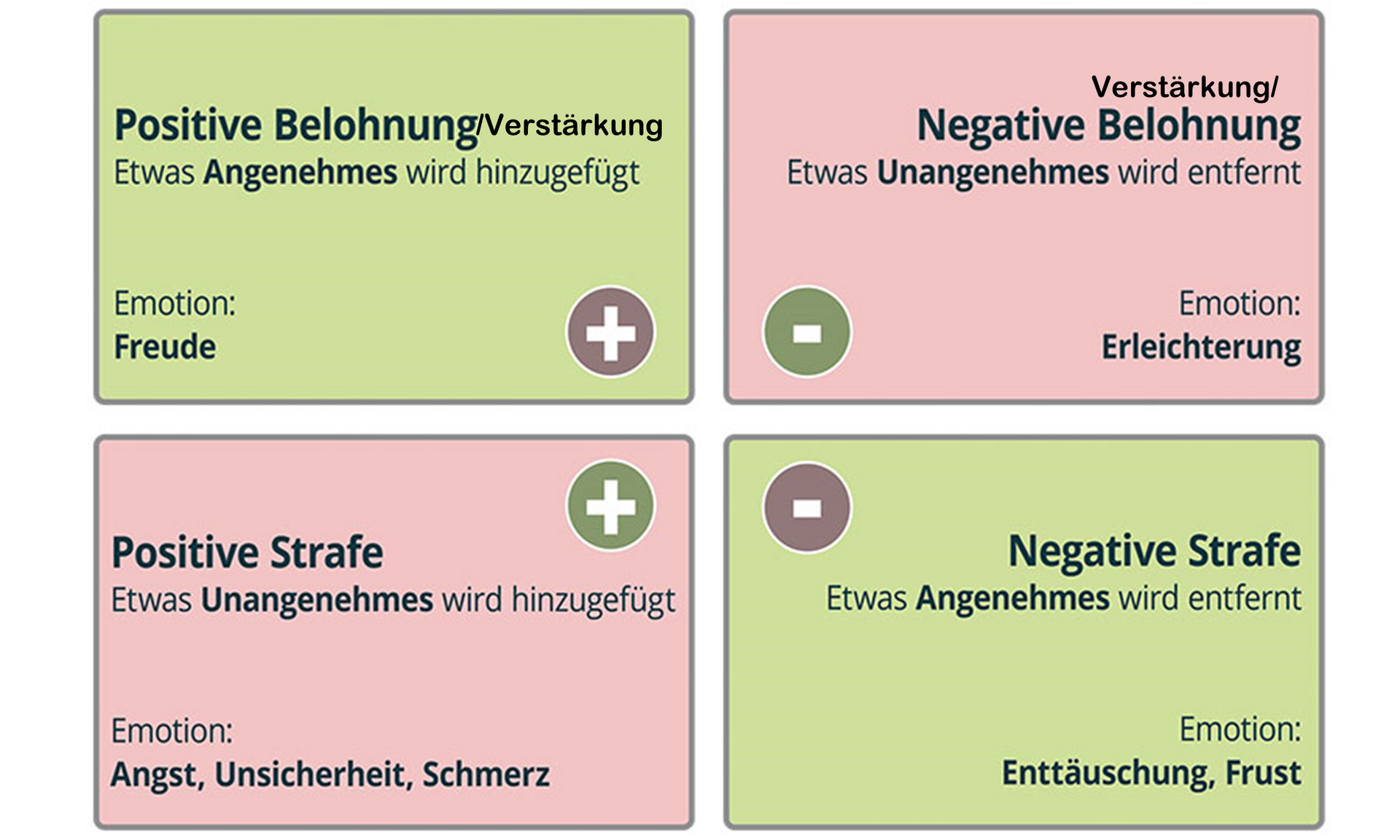 In der Lerntheorie gibt es die operante Konditionierung (auch Quadranten-Modell, instrumentelle Konditionierung oder Verstärkungslernen genannt). Hierbei richtet sich der Lerneffekt an den unmittelbaren Konsequenzen, die der Hund erlebt. Der Hund entscheidet -abhängig von bisherigem Erfolg oder Misserfolg- über sein Verhalten in bestimmten Situationen.